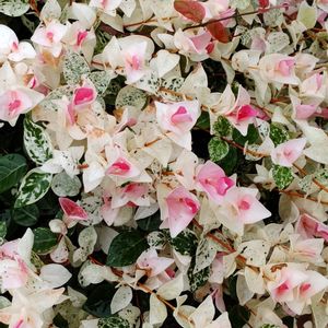 一面にパッと花が咲いたように美しいハツユキカズラ(初雪葛)はテイカカズラ(定家葛)の園芸品種です。 葉っぱに薄っすらと雪が積もったような姿からそう呼ばれています。 新芽は初め濃いピンクで次第に薄くなり 更に進むと白地に緑の斑点になり やがて緑一色に変わります。 初夏に咲く花はクリーム色で余り目立ちません。花芽は前年の夏のうちに出来るため 頻繁に剪定してしまうと花は咲きません…。 秋から冬には紅葉することもあります。 日本・朝鮮半島原産。 キョウチクトウ科テイカカズラ属の常緑蔓性植物。