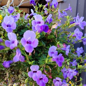 この花はアサリナです。 余り馴染みのない花ですが、キンギョソウやトレニアに似たベル型の花が特徴です。 蔓性で葉柄や花柄が巻き付きながら伸びていくため フェンスやオベリスクに絡ませて緑のカーテンとして楽しめます。 アメリカ南部・メキシコ・ヨーロッパ原産。 オオバコ科アサリナ属の1年草。