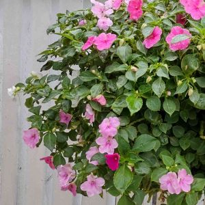 コンモリと育ったこの花はインパチェンスです。 別名アフリカホウセンカ(アフリカ鳳仙花)とも呼ばれます。 インパチェンスの名前はラテン語のimpatient(耐えられない)と言う言葉が語源だとか…。 インパチェンスの熟した莢(さや)に触れるとホウセンカの莢のように弾けて種が広範囲に散らばることからそう呼ばれたそうです。 幼い苗の時に摘心を繰り返すと脇芽が増えてコンモリとした花姿に成長します。 アフリカ原産。 ツリフネソウ科インパチェンス属の 1年草。