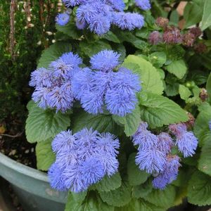 アゲラタムは涼しげな淡いブルーでポンポンのような可愛い花が魅力です。 別名オオカッコウアザミとも呼ばれます。 花期は長く分枝しながら次々と花を咲かせこんもりと茂ります。 花色はほかに白・ピンク・紫色があります。 中央・南アメリカ原産。 キク科カッコウアザミ属の1年草。