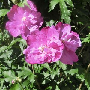 ご近所の玄関先に咲いていた八重のムクゲです。 八重咲きは雄蕊が花びらに変化して出来たようです。 ムクゲは奈良時代に中国から渡来し、古くから親しまれてきました。 朝花が咲き 夕に萎む1日花ですが、花期が長く次から次へと新しい花を付けて夏の間中花を咲かせ続けます。 中国・インド原産。 アオイ科フヨウ属の落葉低木。