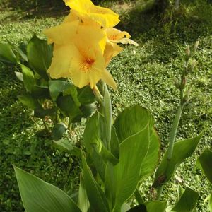 カンナが大きな葉っぱの間から花茎を伸ばし鮮やかな黄色の大輪を咲かせています。 カンナは熱帯育ちで地下に根茎を持っているので炎天下でも土壌が乾燥していてもとても丈夫です。 暑ければ暑いほど生育が良くなると言われる正に真夏の花です。 熱帯アメリカ原産。 カンナ科カンナ属の球根多年草。