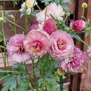 この花は ラナンキュラスの園芸品種 ラックス アイオリアです。 キラキラ 艶々とした花びらが特徴で 日光の当たり具合で 輝き方が違い 様々な美しさ味わえます。 花期は早春から初夏までで 次々と長期間にわたり花を咲かせます。 球根植物で 耐暑性 耐寒性ともあり 植えっぱなしで 翌年も花を楽しめます。 ヨーロッパ東南部原産。 キンポウゲ科キンポウゲ属の多年草。