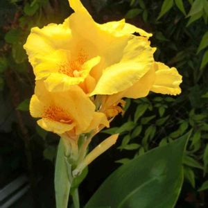 大きな葉っぱの間から鮮やかな黄色の大輪を咲かせているカンナ! 熱帯育ちで地下に根茎を持っている ため、炎天下でも土壌が乾燥しても 大丈夫! これは1850年代からアメリカ・フランス・イタリアなどで交配された品種でハナカンナとも呼ばれています。 熱帯アメリカ原産。 カンナ科カンナ属の球根多年草。