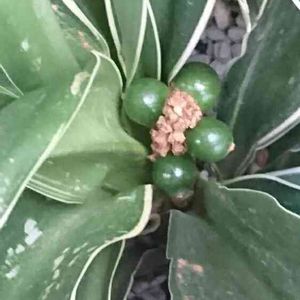 何十年もウチにあるオモト 初めて実がつきました✌ いつも花が咲いたあとそのまま枯れてしまったから⤵ 早く赤い実にな〜れ😊