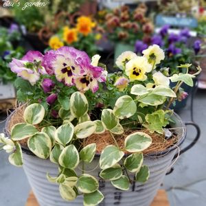 小輪フリンジ咲きビオラ「アールヌーボ」シリーズの‘クリスマスキャロル’は、冬用のウェルカム鉢としてガーデンシクラメンやシルバーリーフと寄せておいたもの。 冬の間にシクラメンもシルバーリーフもみんな🌠🙏になってしまい、お一人様になってしまったので… マーガレット‘ソレミオ’ オレガノ‘ロタンダフォーリア’ タイム‘フォックスリー’ とともに春用のウェルカム鉢にリメイク。 ビオラとマーガレットの間がまだ寂しいけど、も少ししたらマシになるかな?