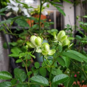 おはようございます☺ バラ エクレール🌿 咲きたてのgreenのお花が雨に濡れて綺麗です。 この子もたくさんの小さな蕾をつけています💓