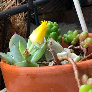 今度は、うちの子🎶 3号鉢の多肉ちゃんにチューリップのようなお花が🌷 花芽が伸びずに咲く、この子のお名前わかりますか?