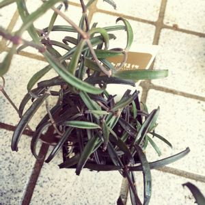 黒錦蝶 叔母から5年ほど前にもらった。 細い葉の先に、小さなハート型の花が咲いた。いつもの緑ではなく、ほんのり赤みのさした茶色。初めてのこと。 石垣島方面で生息する、珍しい多肉植物とのこと。育てているとあらぬ方向にどんどん伸びるので、カットをしてはお嫁に出した。今は僅かに残るばかりになったが、写真右下に種から芽生えた子株が2本生えてきた。
