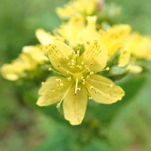 No.79 オトギリソウ 和名:弟切草 別名:薬師草 オトギリソウ科オトギリソウ属 その1 集散花序の黄色の5弁花です🎵 花びらや咢片には黒い点や黒い線があり、これは和名の「弟切草」にあるとおり、兄が弟を切り殺した平安時代の伝説によるものです🎵 鷹匠の兄は、狩で傷ついた鷹を治す薬草を知っていましたが、誰にも教えませんでした🎵 ある時、兄は弟がその薬草の名前を教えてしまったことを知ります🎵 兄は怒って、弟を惨殺してしまいます😠 その時弟の血は、花や葉に飛び散りました🐞 花や葉にあるこの黒点は、弟の血しぶきが飛んでのこったものといわれています😟 うたかたの哀と見るや薬師草 湖山