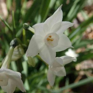 No.245 スイセン(水仙) ヒガンバナ科スイセン属 その2 水仙は雪中四友の一つです🎵 水仙の名所の一つは、越前海岸🎵 その越前に伝わる水仙の物語を一つ🎶 平安末期の源平合戦の際、木曽義仲の兵が京に攻め上がるためこの地を通りかかったときに、手柄をあげたいと思った兄弟がいた🎵 二人で行くわけにはいかなかったので、兄だけが父とともに軍勢に加わり、弟は留守を守っていました🎵 ある時、弟が浜を散歩していると、波間に溺れている娘を見つけ助けてみると、美しい娘でした🎵 やがて、戦いで負傷した兄が帰ってきますが、二人はその娘をめぐって争うことになります🎵 その年の冬、兄弟は荒れ狂う海岸で対決します🎵 その二人の姿を見た娘は、「二人の仲を悪くしたのは私のせいです」といいのこし、荒波に身を投じます🎵 不思議にもそこはかつて娘が助けられた海岸でした🎵 翌年の春、その海岸に見たことのない美しい花が流れ着き、村人たちは娘の化身だろうと噂し、その可憐な花を丘の上に植えました🎵 白鳥が生みたるもののここちして朝夕めづる水仙の花 与謝野晶子