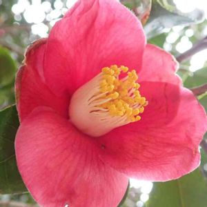 No.264 ヤブツバキ 和名:薮椿 ツバキ科ツバキ属 その1 日本に自生するツバキは3種類あり、ヤブツバキ、ユキツバキ、そしてヤクシマツバキですが、ユキツバキとヤクシマツバキはヤブツバキの亜種、変種とされています🎵 ヤブツバキは照葉樹林を代表する樹木の一つです💕 関東以西では内陸部(標高800m以下、九州の霧島では1000m以下)まで分布しますが、東北地方では北上するにつれ徐々に高度を下げ、沿岸部にのみ分布しています🎵 太平洋側の北限は、青森県の夏泊、日本海側の北限は青森県の深浦あたりですが、北に行けば断片的に海岸線にあらわれます🎵 このことから、八百比丘尼の伝説が伝わっています🎵 昔人魚の肉を誤って食べた娘が、不老不死になり、夫や子が年老いて亡くなり、自分だけが生き残っていることを不幸に思います🎵 この不幸を背負い、世を儚んで、尼になって全国各地を放浪し、神仏への信仰をときます🎵 八百比丘尼は、その放浪先で椿を植えたとされ、薮椿が日本各地にあるのはこのためとされています🎶 白よりも紅の椿の寂しさを知りて歎けば君もなげきぬ 与謝野晶子