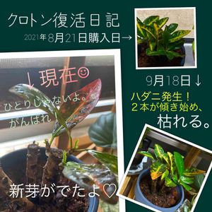 【クロトン】 遠方の100均で購入した3兄弟のかわいいクロトン。 しかし枝を切って植えただけだったようでグラグラ状態。仕方なく植え替えた時にも根が殆ど出ていませんでした。 しかしとりあえずそのまま様子を見ていると、更にハダニがいたようで葉に赤いダニがついていました。 葉水を頻繁にする事でハダニはいなくなりましたが、根がないので2本がすぐに枯れ始め、丸坊主にww 大きく傾いている事からも根からアウトです。 諦め半分、研究心半分で観察を続行。 すると、どんどん痩せていく坊主兄弟たちの中、なんとか生き残っている1本が新芽を出してくれました!! 今のところこのコの幹は痩せずにいるようです☺︎ まだどうなるか分かりませんが、この春に枯れた2本を捨てて新しい鉢に植え直して環境をクリアにしてあげようと思います。 ちょっと植え替えに不安がありますが…。 君の生きる意志は必ず守ってみせる!! 君のペースでがんばれクロトン!!