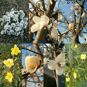 2月末見かけた花達、コブシのや木蓮(ここには無い)、レンギョウ(ケナリ)、開く前のコブシもバラ風に見えるな 左上の見た目小手毬風の地表面に咲く白の群れた花は、何の花かな?←アリッサムだとか