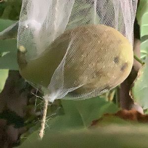 今朝、袋の中に落ちておりました 3年生のバローネの9個目の秋果です 果実は30gで果肉は軟らかでしたが、甘味は薄く、あまり美味しくはありませんでした 20250914収穫 20250914撮影