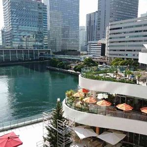 商業施設の中、高層ビルが建ち並ぶ風景を眺めながらgreenが感じられる場所♡ 赤いテントがかわいいな〜