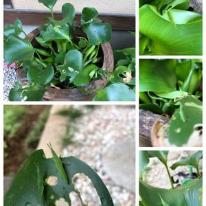 朝パト ① 布袋草にバッタの家族 布袋草美味しいの❓ 葉っぱ穴だらけ😭 バッタさんいっぱい食べて下さい💕