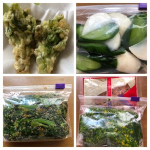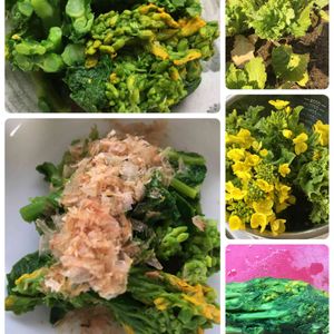 春です❗️ って言いたいぐらい 菜花が育ってます 15cmぐらい穂先を摘んで 塩を適当に入れて茹でる 30〜40秒ぐらい 茹で過ぎ注意 コクがあって 苦味があって(花が多い程苦い) 美味い❗️😋 鰹節が好きです😊