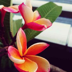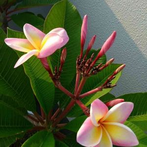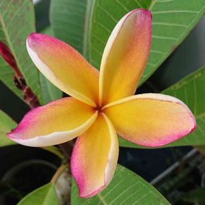 プルメリアレインボー🌈 今朝、初めて咲きました😊 プルメリアと言えば白+黄色の 花びら。 レインボーは、それにほんのり 赤が入った 優しいグラデーションが素敵ですね😍 来年は枝を切って背を低く😊 葉っぱが大きいので台風🌀なんかで 鉢が倒れるのが怖いですから😓
