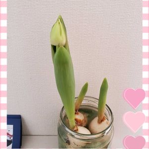 おはよう👋😃☀️ございます 🌧️です 春休みどこにも行かずなので、今日は吉野公園にでも連れていこうと話をしてましたが🌧️です 残念😣💦⤵️ リビングで水耕栽培していたチューリップ🌷 一本だけスクスク伸びて、蕾がはっきりしてきました~🎶 今度の秋はもう少し早く、もう少し勉強して全部の花を見たいと思います🙋