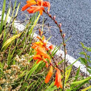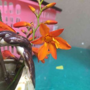 🇯🇵 近所の庭に咲いたヒメオウギスイセン(ヒメオオギスイセン) オレンジ色が眩しい🤗