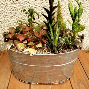 多肉たち~💦 昔からいる多肉ちゃんたちを個々の鉢から一つにまとめました‼️ フライングタイガーで買った4つに分かれているブリキのバケツ。砂が流れにくくて入れやすかったです。 ハムスター🐹の妖精🧚♂️が住んでます(*´▽`*)