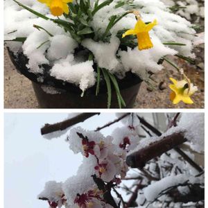 おはようございます 雪でせっかく咲いたミニ水仙が〜(T ^ T) 梅の花にも雪です☃️ この時期の雪は重いから💦 今日の古民家作業どうなる⁉︎ 頑張って行ってきます😊🍙
