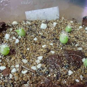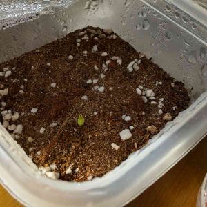 サボテンガチャで手に入れた 花サボテン一つ目発芽 ヒートマットで暖めて光を当て続けた効果も出てると思う ちなみに中央に発芽してない柱サボテンの種を置いてる
