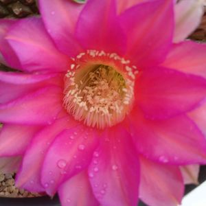 今年の花サボテン一輪目の開花🌼 昨年より淡めの花色が咲きました。 …とは言えノンフィルターでも十分派手ですが〜(笑