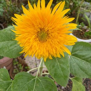 小さい鉢に。ちょこんと、咲いてます。八重咲きの向日葵!私には、このくらいの高さが、丁度良い。😅