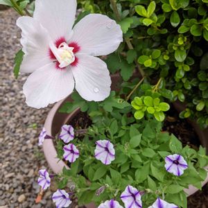 ムクゲの花が、咲いてくれました。スパーチュニアと、御一緒に!😅🌞🥳💁