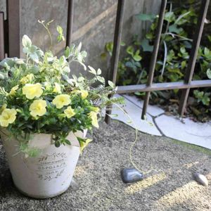 優しいイエローのカリブラコアの寄せ植え カリブラコアは雨にも強くて頼りになります。長く伸びた斑入りのアケビが、お気に入りです。 カリブラコア、斑入りアケビ、レプティネラ、ロータス コットンキャンディ、ヘリクリサム
