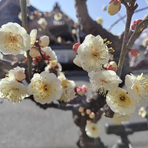 鹽竈神社 白梅が咲いていました。 ピンク色ががった白梅でした。 まだ満開ではなく、ちらほら咲いている中で集まって咲いているとこを撮らせていただきました。