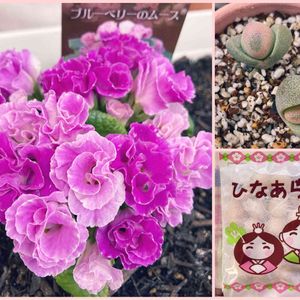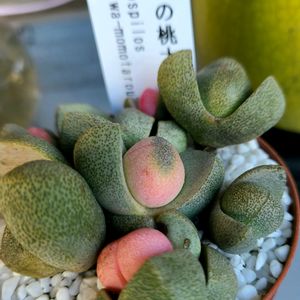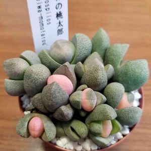 【プレイオスピロス「令和の桃太郎」】 アフリカ南部原産、ハマミズナ科多肉植物 丸みのある多肉質な葉の間から新芽がでる不思議な草姿の「令和の桃太郎」 「メセン(女仙)」と呼ばれる多肉の仲間で、脱皮をして成長する植物。 桃のように見える愛らしいピンクの色合いがとてもきれい。 秋頃にピンク~オレンジ色の可憐な花を咲かせることもある。 ガーデンマルシェ@防府市