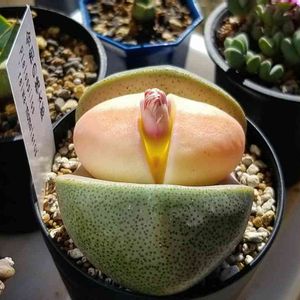 個性派✨プレイオスピロスたちです🌟 リトープスと比べると、イカつい子たちだと思っていましたが、こうして並べるとおいしそうですね🤤 新感覚⭐︎スイーツ🎶 ところで左上の紫帝玉、お花を楽しみに待っているんですが、長い間カニ🦀状態・・・ 魚介類かスイーツ、どっちを目指しているんでしょうね⁉️ (どっちでもない😆💦)