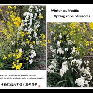 【郷土の花華シリーズ:水仙&菜の花編】 💠水仙:Daffodils//房咲き水仙:tazetta 別名:paperwhite/bunch-flowered narcissus/Chinese sacred lily/cream narcissus/polyanthus narcissus.etc., 🌼菜の花:Rape blossoms 📝この写真画像は、従兄弟の家の垣根の一部に咲いていた房咲き水仙と菜の花が満開の様子を写したものデス🐶 一般に水仙は冬の花、菜の花は春の花として代表的な花デスが…⁇房咲き水仙が遅れて咲いているのかな? 花たちの白と黄色の彩りが美しく映えて、珍しい組み合わせなのでパチリしてみました🐶 《一九献上》 「水仙に戯れて咲く菜の花や」 @"The spring rape blossoms blooming together with the winter white daffodils are playing happily." 大意;冬の白い水仙たちと一緒に咲いてる春の菜の花たちが楽しそうに遊んでいます。 ✍️Works:Poetaster Kazyan//筍歌人;藪中和堂 【豆知識】 💠房咲き水仙の花言葉; 「私の愛に応えて」「騎士道精神」 🌼菜の花の花言葉; 「快活」「明るさ」 Artistic:Daffodils & Rape blossoms Mar 4,2023:past ;16:30’;📱shooting Mar 5,2023:past am 06:00';upload//Instagram by Kazyan’s Green Studio