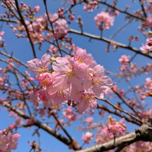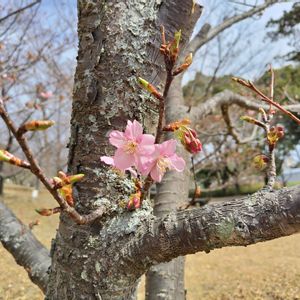 公園の河津桜の梢の向こうに昼の月が出ていました。 近いのでお昼ご飯食べてから出てきましたが、桜の下でお弁当食べたかったなあ🍱 でも風が強くて寒かったからちょっと無理でした🥶