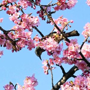 カワヅサクラ🌸とメジロちゃん🪽 可愛くてついつい何枚も投稿します😘 1️⃣真っ逆さまでもいただきます 2️⃣撮影ですか?はいどうぞ✋️ 3️⃣やっぱり美味しい、 いただきますよ👌 と言っているみたいですね😊 いつもは2羽ですが、 今日は4羽来てくれたので 撮影しやすかったです👌