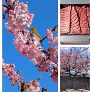 お墓参りも済ませ わが家で河津桜の花見しながら 友人たちと一緒にバーベキュー しましたよ😁 友人がA5のお肉を持ち込み とっても豪華な花見です✨ 一緒にメジロちゃんも参加しています😍