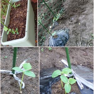 【 キュウリの種 】 第2弾 大きくなるの待てなくて、 地植え、プランターへ。 マルチして、乾燥、防草、 マルチなしで、自然体株 色々やってみました。 とりあえず、 第1弾は、まだ残してるけど、 収穫は出来そうにないです。 早く 大きくな~れ 🌱🌱🌱✡。:*๛ก(・ω・ก)