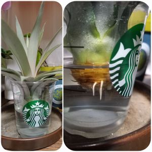 🍍パイナップル🍍 クラウンを水差しして1ヶ月、根っこが出始めました(*•̀ᴗ•́*)👍 もう少ししたら鉢に植えようと思います(*´艸`)