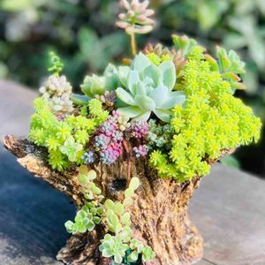1年前に寄せた多肉 現在、セダムがもりもり溢れてたよ〜 ・ ・ 木のモルタルプランターと一体化した 🌳をイメージして エケベリア抜いて全てセダムにチェンジしちゃおかな〜って思っちゃうほど😆 ナチュラルな感じが お気に入り〜