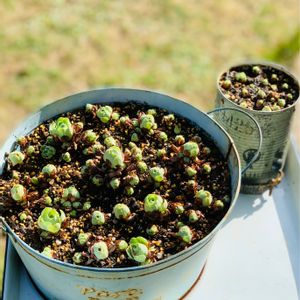 昨年兜丸の実生をお迎えして リメ鉢で育ててた2つを プラ鉢に植え替えしたよ! そして上の写真の プラ鉢の中の3つは 成長良好だったから、よしっぴランドでの 2周年祭の時に嫁ぎました🙌 (6センチポットに各1つ計3個) 写真残して無かった〜😅 後で聞いた話しですが カクタス広瀬さん曰く とてもスペシャルな兜丸だって😳✨🙌 ナンチャラ〜#¥☆4*って名前聞いたけど 忘れちゃった😅💦 我が家の残り2つ‥大切に育てよ〜🤣 今月も宜しくね