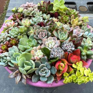 今日の寄せ植え5つ😁 古いリメ缶、初期に作ったリメ缶。 空っぽだったので庭の多肉で寄せました。