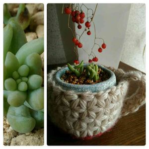 多肉好きさんにいただきました😚鉢と多肉用土を買ってきて植えました。カバー作ってくれました😚名前❓AIの回答これだにした🤗