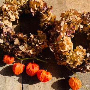 2019.12.4 1か月前に作った秋色あじさいのリース。 車庫に飾っていたらこんなに変色しました💦 もちろんノブドウはしわしわカラカラ。 飾るなら日光の当たらない家の中の方が良さそうです😃 秋色あじさいのリースについてはみどりのまとめをご覧下さい🤗