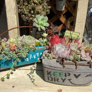 ikuraさんの飛び出セダム箱とコンクリ鉢😆💕 スカスカしたとこをちょっと足して~ コンクリ鉢は勿体なくて使えなかったんだけど、このお休みの間にやっと❤ 相変わらず寄せ植え下手くそだから ごめんなさいっつ🙏