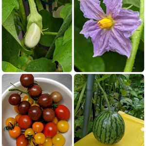 家庭菜園 白ナスと白ナスの花💜 カラフルなミニトマトたち 💛🧡♥🖤🌿 小玉スイカ🍉 小玉スイカの苗は花友さんからの🎁✨ こんなに大きくなりました🎶 収穫して食べるのが楽しみです😄😋