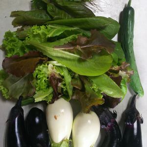 おはようございます。 今朝の収穫です。 長雨のおかげで野菜たちは元気です。 あまり太陽が出ないのでミニトマトはまだです。