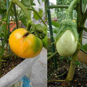 茹で卵がなりました🎶 は、冗談ですが、おのたん様からの苗。 白ナスと桃太郎ゴールド。 いよいよ収穫が近いと思っていたら、昨日の雨で割れた😥 早いけど採ります。 ナスも雨で大きくなった。 一番果なので早めの収穫しないと。 昨日の熱帯低気圧、風はたいしたことなかったですが、雨が昨年の豪雨を思い出すような降りでした。 娘も傘とレインコート着て下校したのに、服もランドセルもびしょ濡れ💦